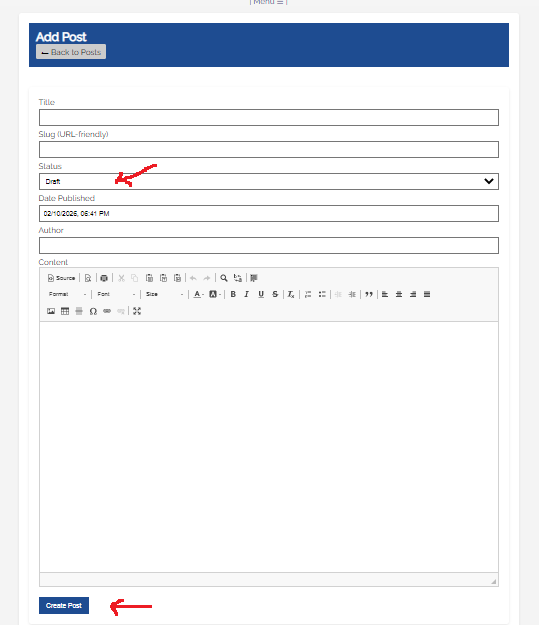 - When you select "Draft", only the title will display on the Blog, but the contents will not display. Draft mode can only be viewed when you are logged in, and you can change the Status to "Published".